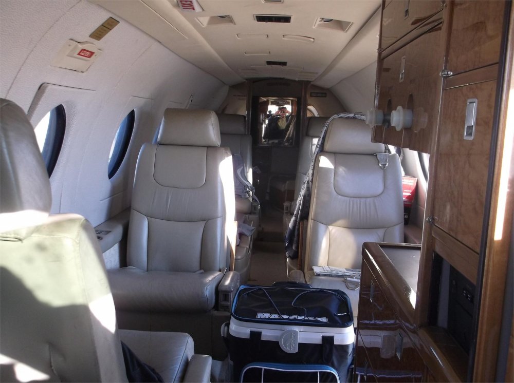 - Eight passenger configuration with tan leather seating, beige headliner and tan carpeting. Entertainment system with DVD player, Airshow 200 and three 6.5″ monitors-custom galley-dual mapcos.