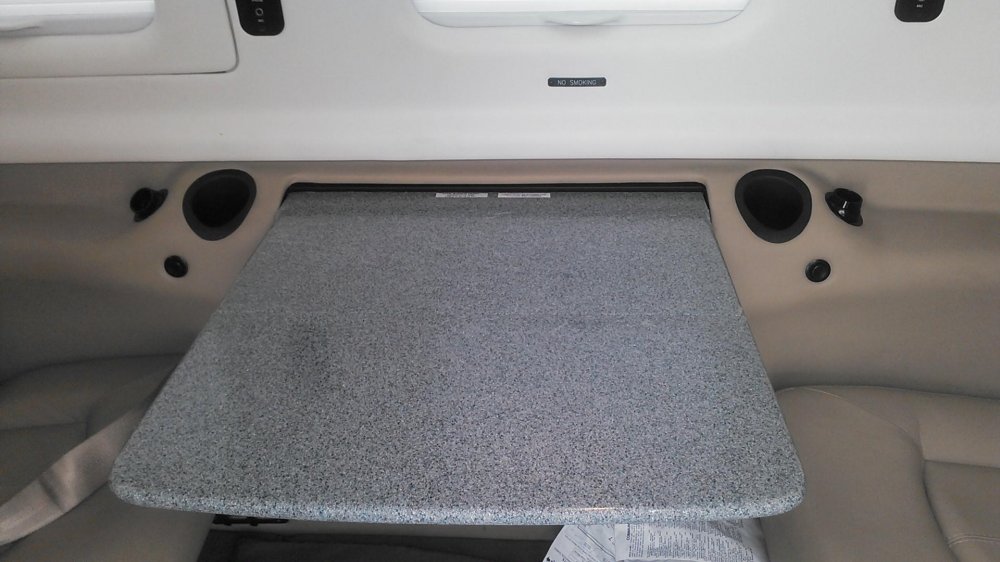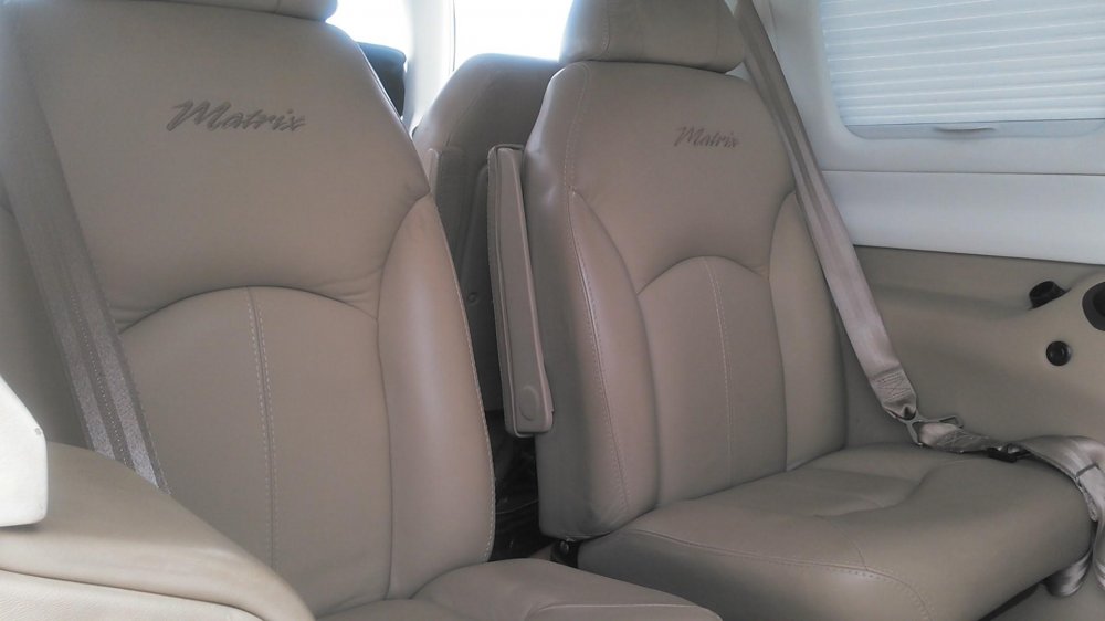Tan leather seating & carpeting.